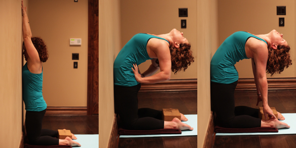 Manteniendo la cadera pegada acomoda las manos por detrás en el sacro, levanta el pecho, realiza un pequeño arco y deja caer la cabeza.