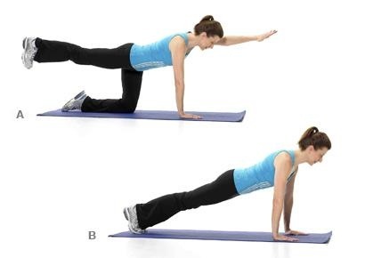 A. Apoya las rodillas en el piso. Levanta una pierna hacia atrás y al mismo tiempo el brazo contrario.
