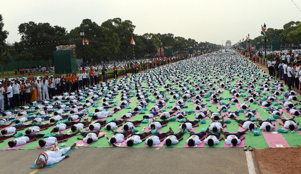 Narendra Modi, Primer Ministro de India encabezó el primer Día Internacional del Yoga subiéndose él mismo al tapete para guiar una clase que duró aproximadamente 35 minutos en un bulevard de Nueva Delhi.