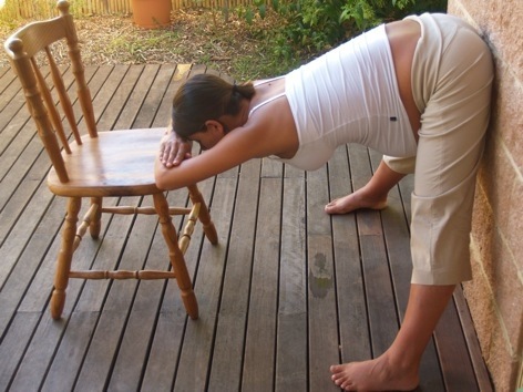 Acerca una silla o a una pared. Apoya tus brazos al frente y rota tu cadera para bajar a la mitad