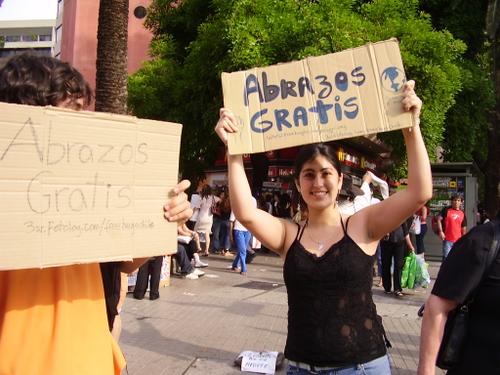 De unos años para acá ha surgido esta modalidad de performances, flashmobs o simples intervenciones callejeras de expresión humana. Quieras recibirlo o no, el hecho de ver a alguien parado a media calle con un letrero que diga ABRAZOS GRATIS, remueve tus fibra sensibles.