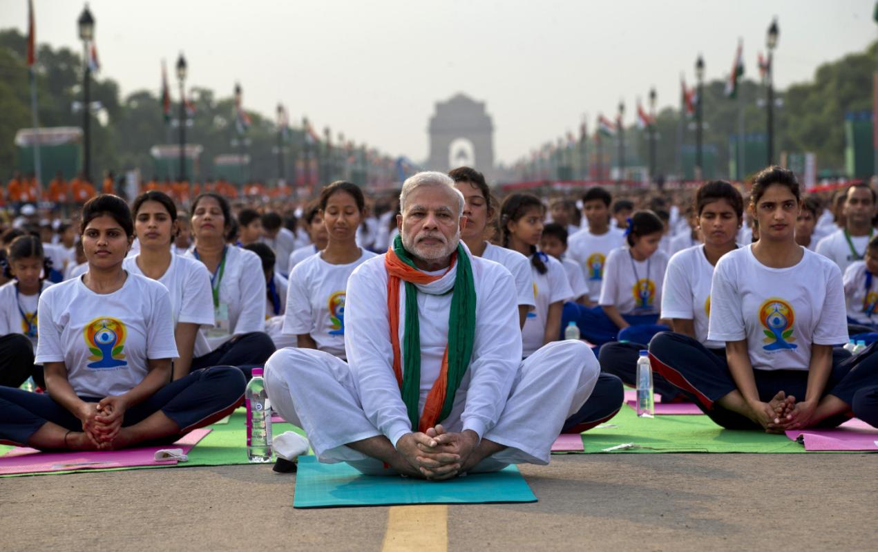 Narendra Modi, Primer Ministro de India encabezó el primer Día Internacional del Yoga subiéndose él mismo al tapete para guiar una clase que duró aproximadamente 35 minutos en un bulevard de Nueva Delhi.