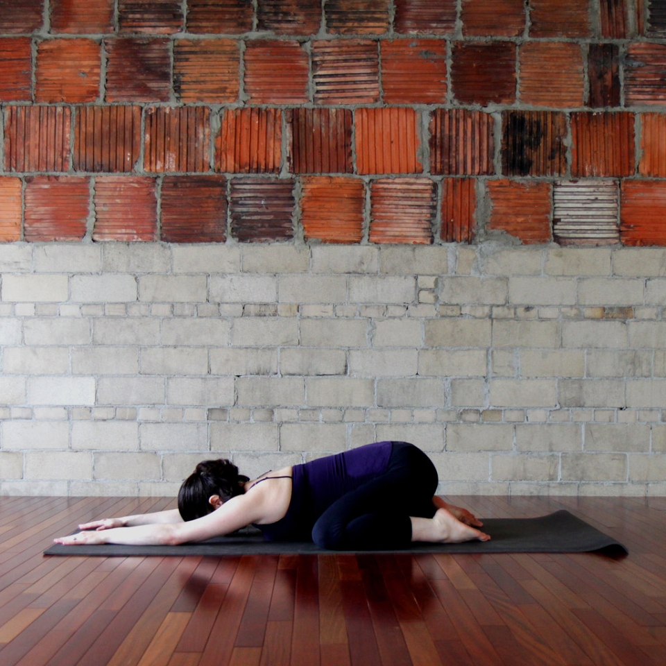 2. Postura del niño. Esta postura es un clásico, entre algunos de sus beneficios están, el alivio de los músculos de la espalda y su efecto en calmar la mente. Trata de apoyar tu cadera sobre los talones, si te cuesta trabajo puedes separar ligeramente las rodillas para acercar tu cabeza al suelo mientras estiras los brazos hacia el frente.